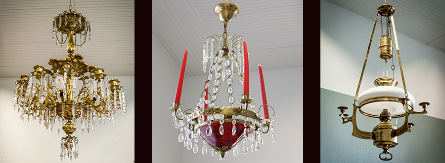 Светильники (19-20 век), хрустальные люстры, настольные лампы, торшеры, масляные лампы, а также ретро- и дизайнерские светильники.